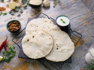 -Heat nonstick griddle,place rolled dough & cook from both sides until light golden then remove griddle & cook it directly over a high flame (makes 4).