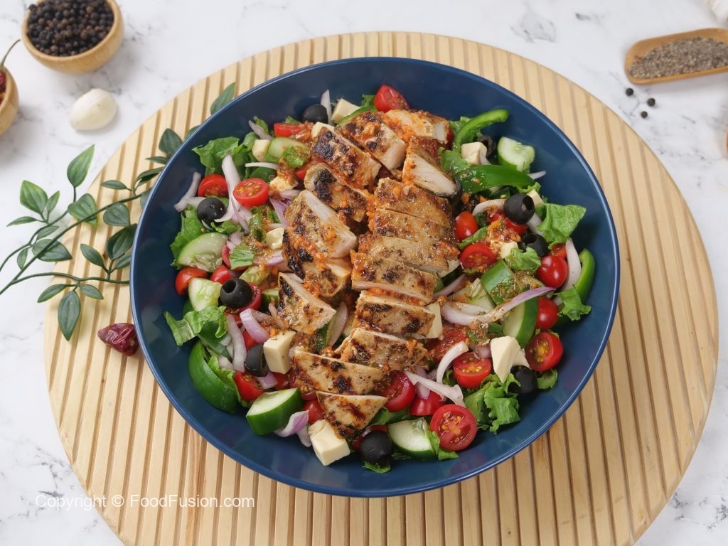 -On a frying pan,add cooking oil,marinated Greek chicken (thawed overnight) & cook on low flame from both sides until done (3-4 minutes each side).