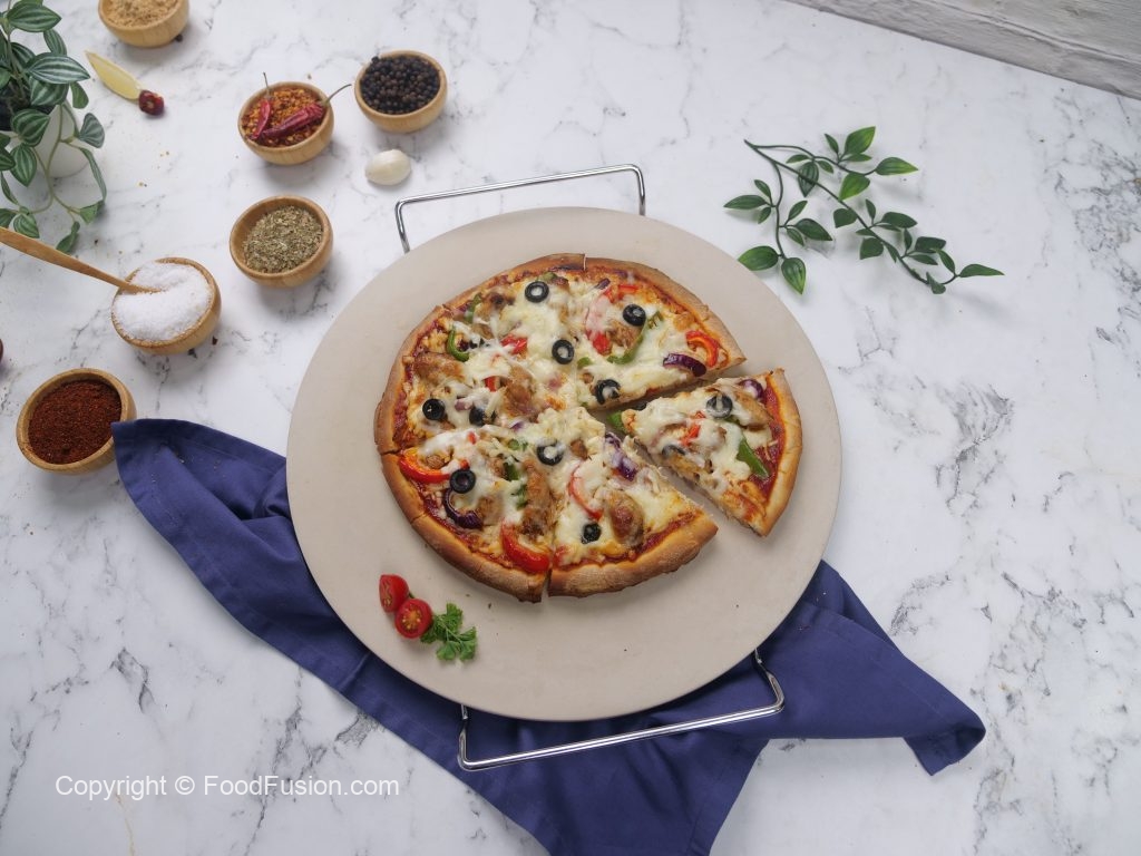 -On pizza base,add & spread pizza sauce,cheese,cooked fajita chicken,red bell pepper,capsicum, onion,cheese,black olive & bake in preheated oven at 180C until cheese melts (8-10 minutes).