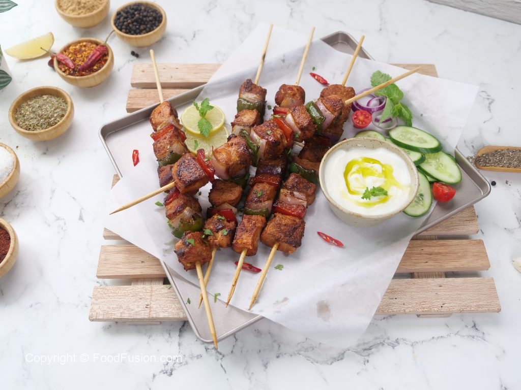 -Skew fiery chatkhara marinated chicken (thawed overnight) on wooden skewers along with onion,capsicum & tomato.