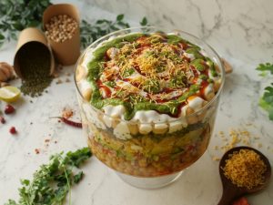 -In a deep serving bowl,add boiled chickpeas,chaat masala,red chilli crushed,prepared hari chutney, mixed vegetable salad,boiled potatoes,prepared meethi chutney,peanuts,sev nimco,prepared yogurt meethi chutney,hari chutney,papri,boiled whole green gram,chaat masala,dahi phulkiyan, yogurt,meethi chutney,hari chutney,red chilli crushed,sev nimco & serve!