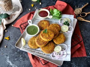 Grease hands with oil,take small quantity (60g) & make kabab of equal sizes (makes 19-20).