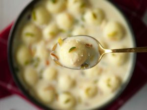 -In boiling milk,add prepared balls & cook on very low flame until they float on the surface & increase in size (don’t stir),cover & cook on low flame for 10 minutes.
