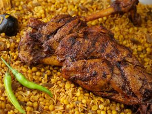 -On a serving platter,add & spread prepared rice,daal & raisins,mutton leg & garnish with green chillies & serve!