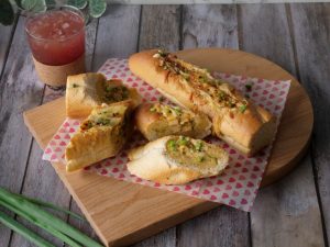Place French baguette on a baking tray lined with butter paper & grease with butter.