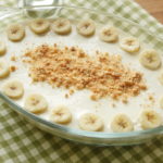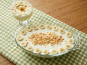 In serving dish,arrange sliced bananas and biscuits evenly.
