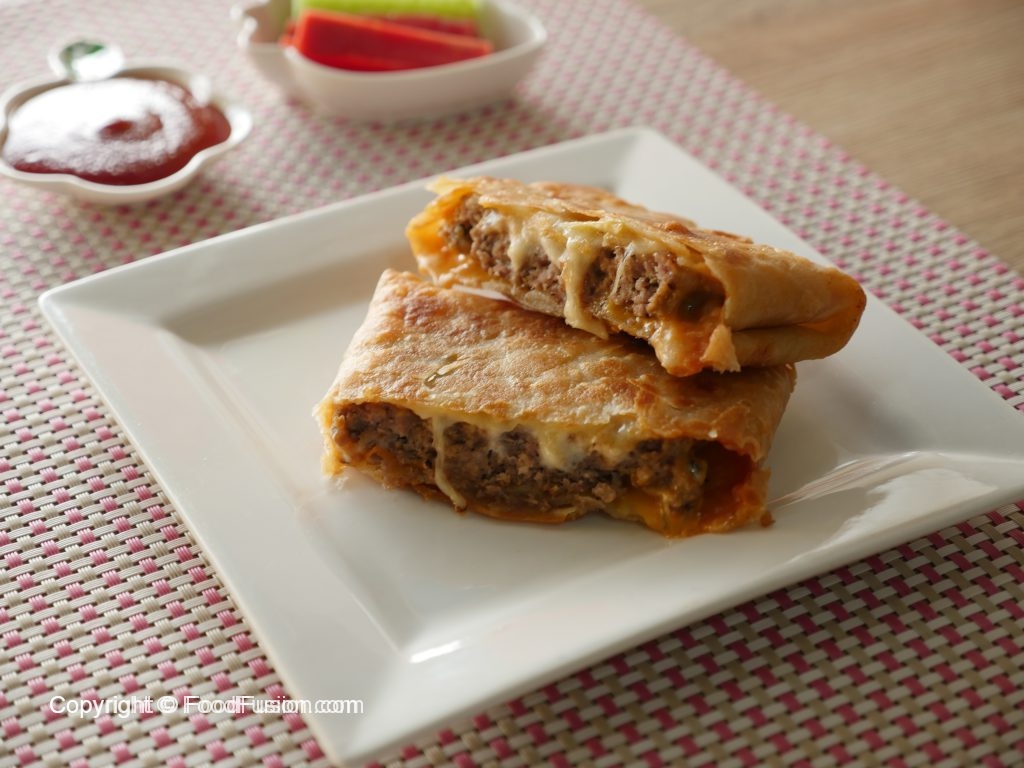 Place beef patty and fold all edges of flat bread (roti) and apply egg white to seal the edges.