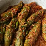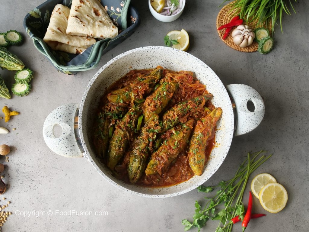 -Add stuffed bitter gourds,cover & steam cook on low flame for 5-6 minutes.