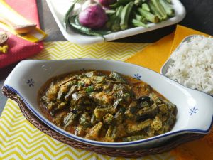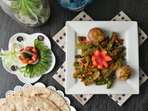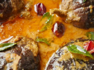 Take egg plants,make 4 small cuts in the eggplant but don’t separate them and keep them intact, including the stem,sprinkle salt and stuffed with ground spice mixture & set aside.