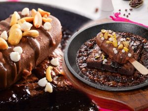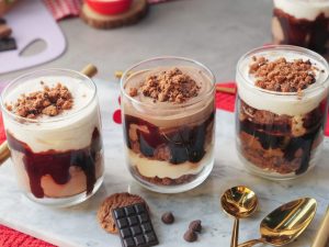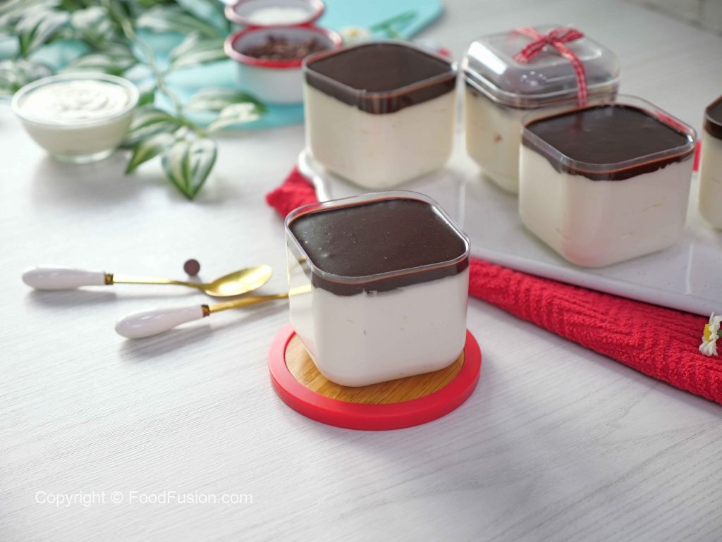 -Upper sa tayyar chocolate ganache pour karein (makes 6) & serve karein!
