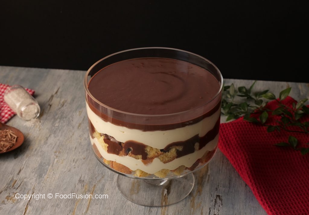 -Serving dish may sponge ki layer, prepared boston cream, spong cake, prepared chocolate ganache, prepared boston cream daal den. Ab upar se chocolate ganache daldein aur thanda ho janay tak refrigerate ker lein.