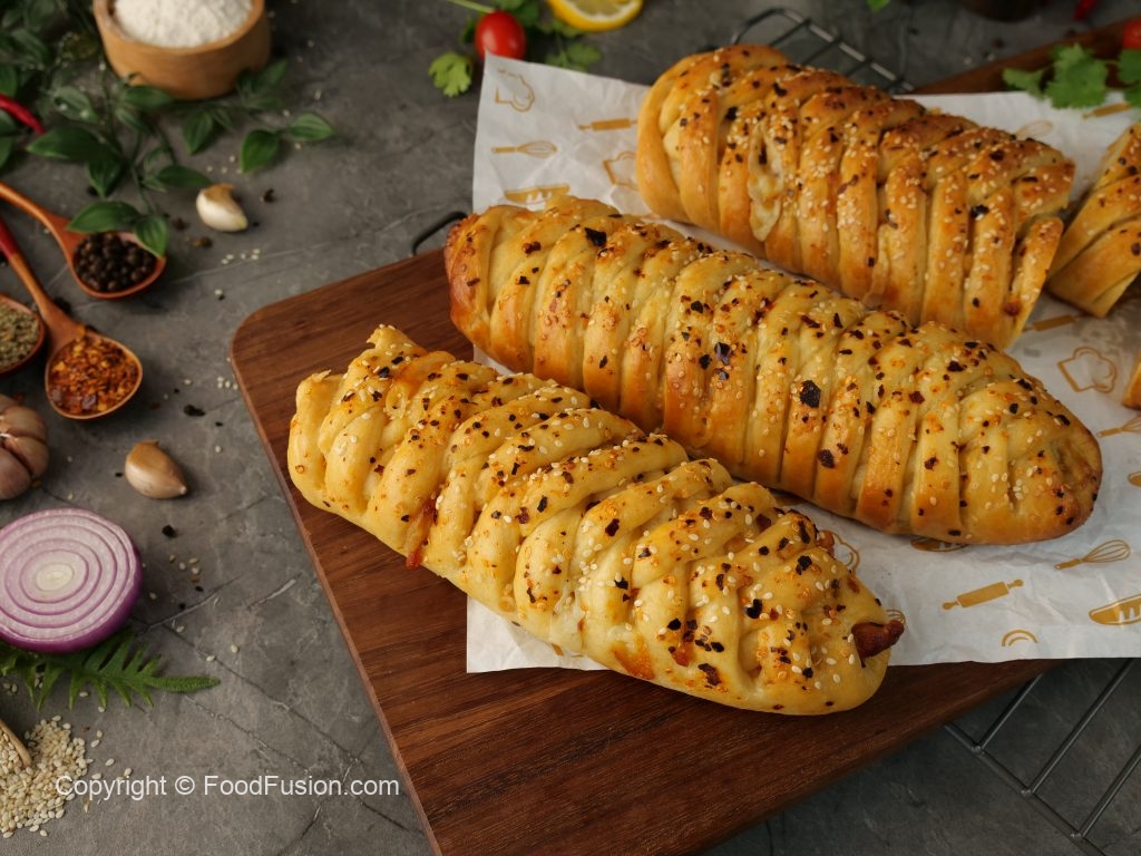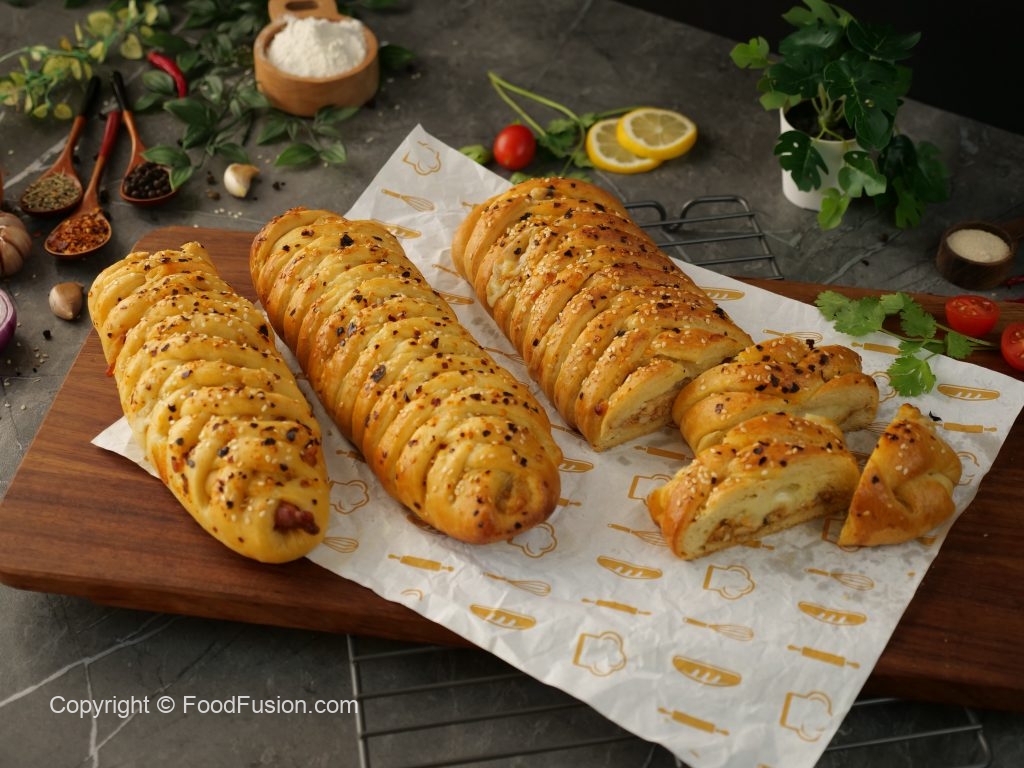 -Braid ki tarhan overlap kertay hoye bread ka cuts ko alternately bund kertay jayein.