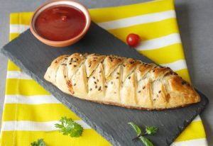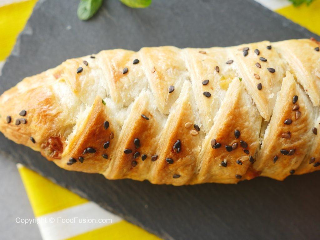 Braid ki tarhan overlap kertay hoye bread ka cuts ko alternately bundd kertay jayein (makes 4-5).
