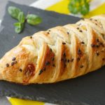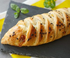 With the help of the brush,apply egg on braided bread and sprinkle black sesame seeds.