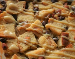 Bread cubes,badam,kishmish,chocolate chips,tayyar anday ka mixture,bread cubes,kishmish,badam, chocolate chips aur tayyar anday ka mixture dal dein.