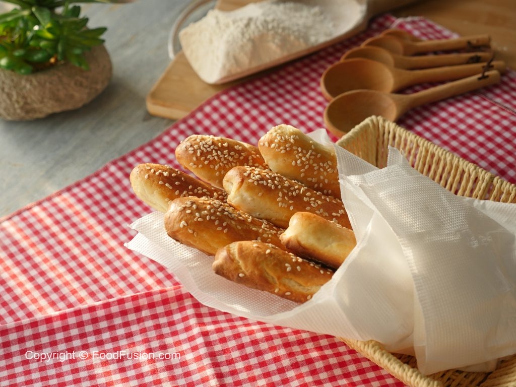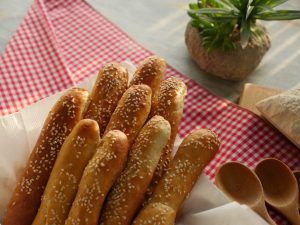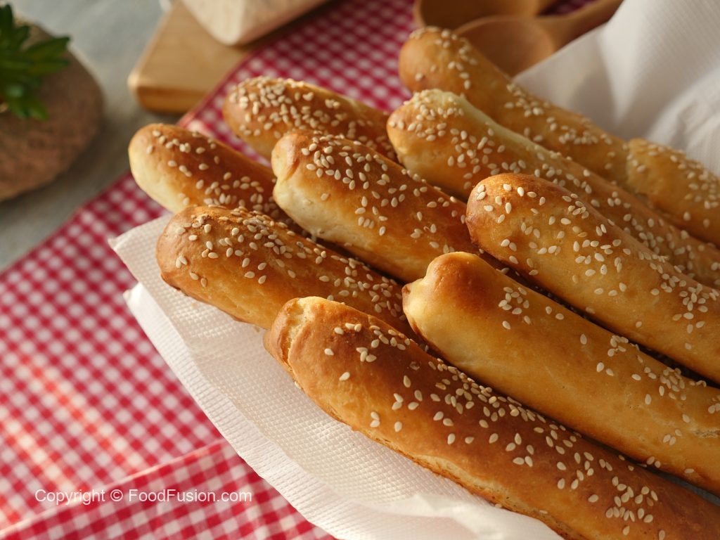 Brush breadsticks with egg white+water and sprinkle sesame seeds.