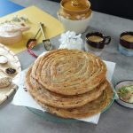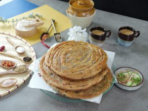-Add & spread clarified butter,sprinkle garlic,prepared spice mix,fresh coriander,fold the paratha vertically from both sides & roll up.