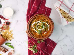 -Add prepared chana daal qeema & garnish with fresh coriander,ginger,green chilli,cream & serve!