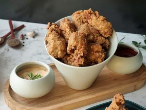 -Take cooked chicken tikka piece, dip in pakora batter & fry in pre-heated cooking oil.