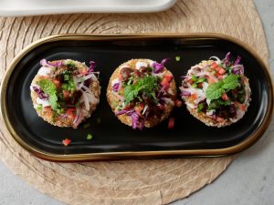 On aalo tikki,add yogurt,cabbage,onion,capsicum,tomato,fresh coriander & prepared chutney.