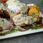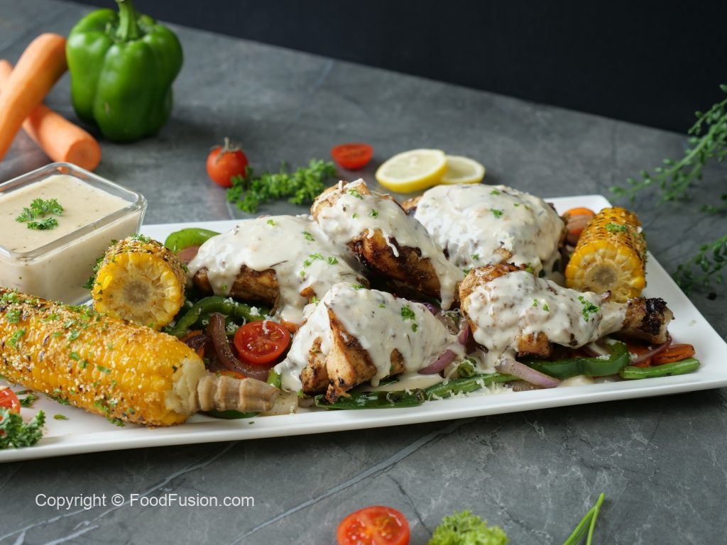 -Grate cheese with the help of grater & pour prepared garlicky cheese sauce on chicken tikka pieces,fresh herbs & serve!