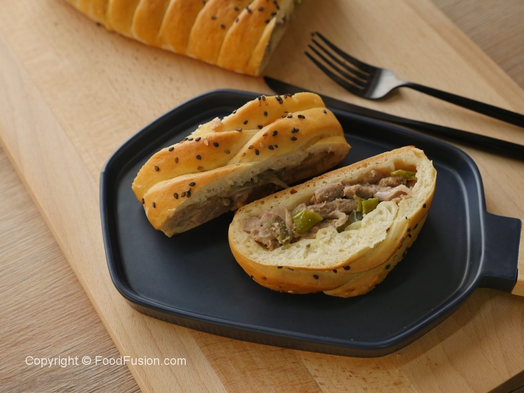 Braid ki tarhan overlap kertay hoye bread ka cuts ko alternately bundd kertay jayein (makes 2).