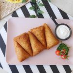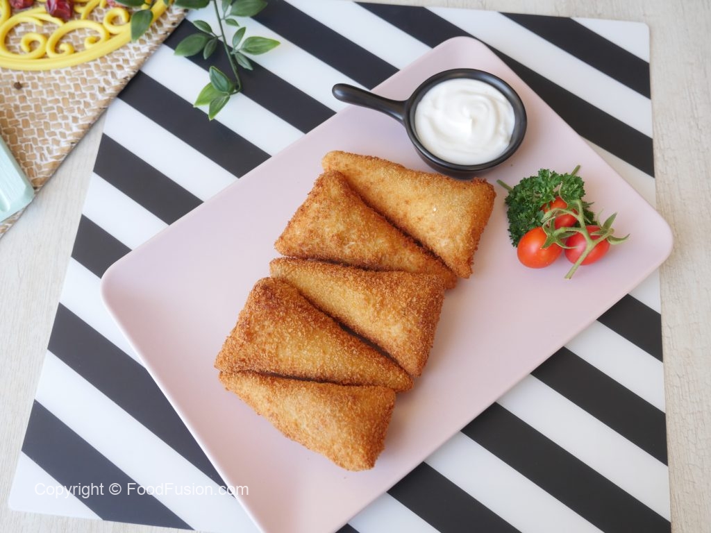 Brush flour slurry on one side of bread and fold bread slice to make a cone,add chicken filling (1 & ½ tbs),mozzarella cheese (1tbs),apply flour slurry on the edges and bring the edges together and seal the edges properly.