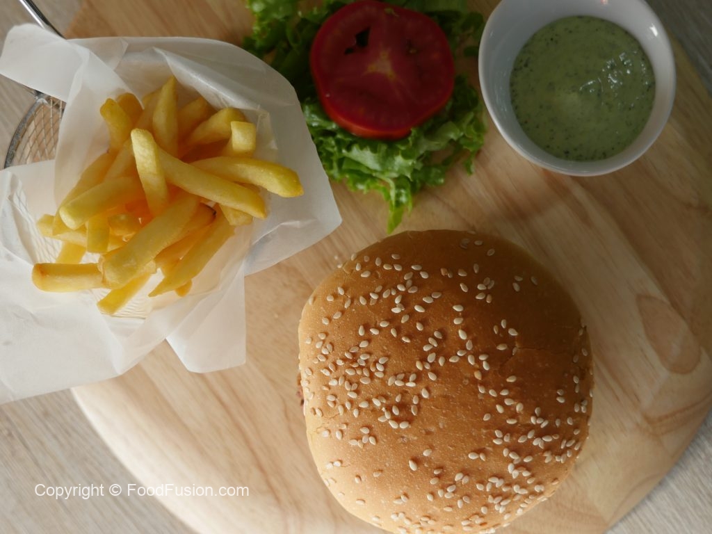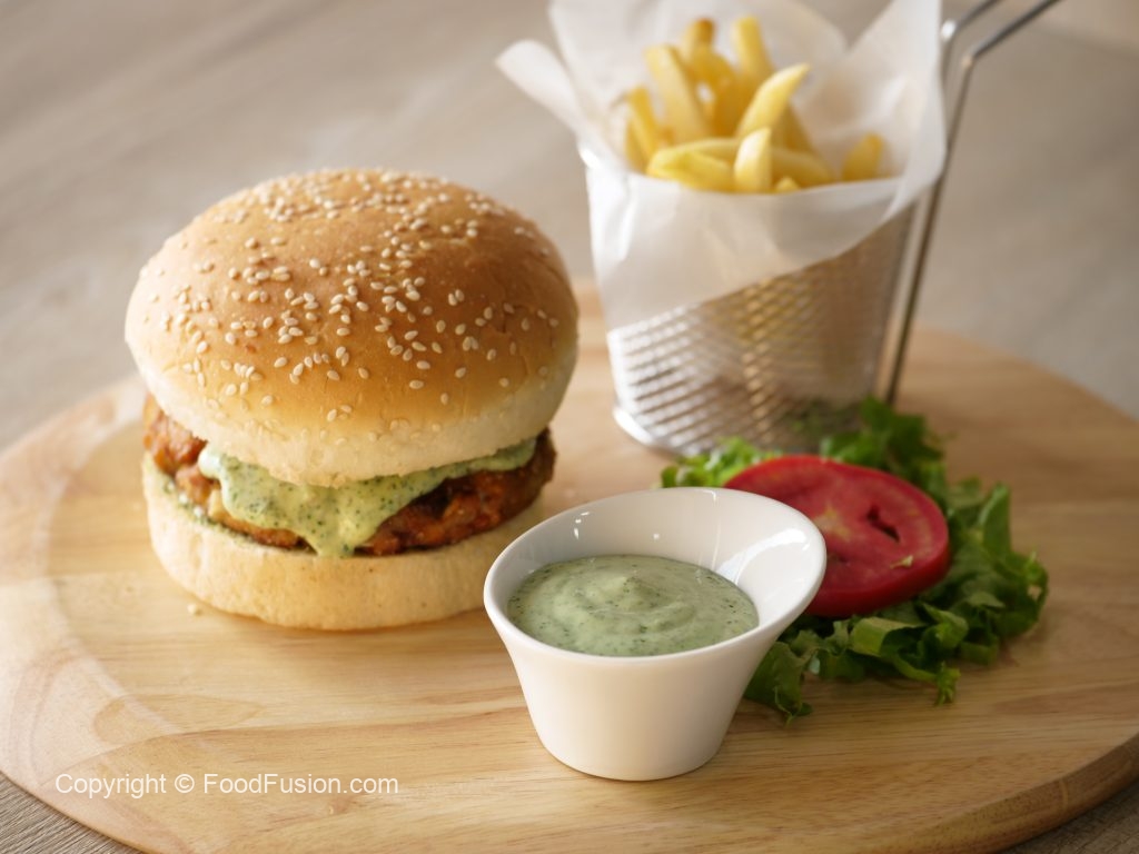 -On burger bun,add & spread green chutney,add onion rings,chicken chapli kabab,tomato slice,onion rings,green chutney and top with another bun & serve.