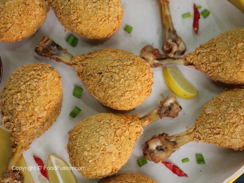 -Ab chicken drumsticks ko maida mein coat karein aur pheetay hoye anday mein dip ker lein phir cornflakes mein coat ker lein.
