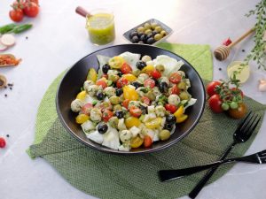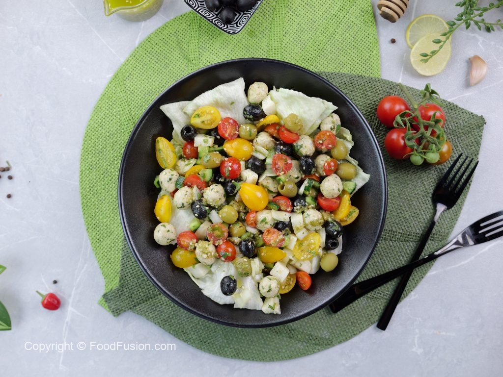 -In a bowl,add iceberg lettuce,prepared mini chicken kafta (approx. 30),black olives,green olives,cucumber,reddish, onion,yellow cherry tomatoes,red cherry tomatoes,fresh coriander,2-3 tbs of prepared gm salad dressing & give it a good mix.