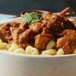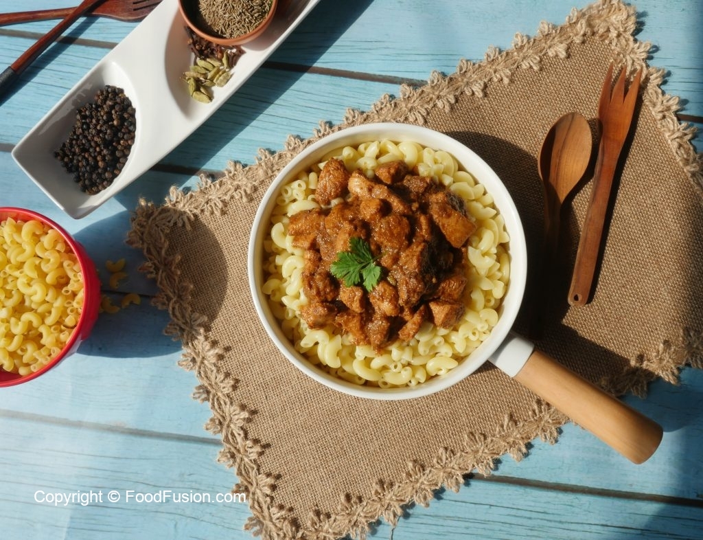 Serving dish mein boiled macaroni aur korma masala dal ker serve karein!