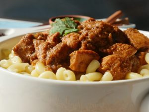 On serving plate,add boiled macaroni,korma masala & serve!