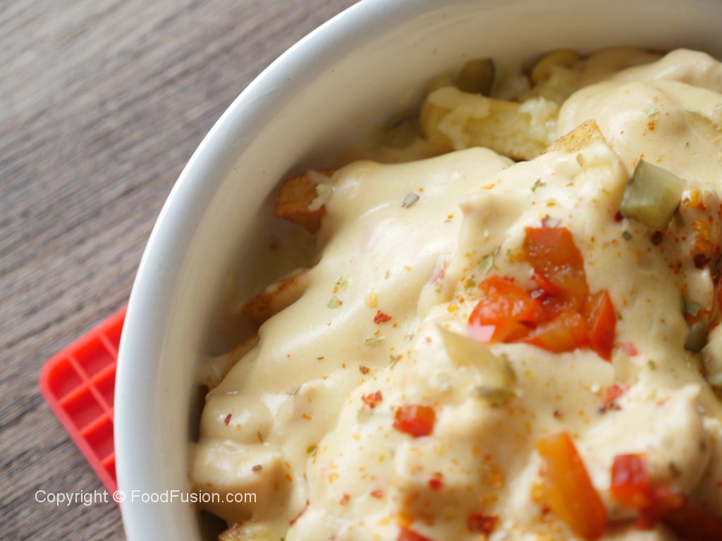 Serving platter mein potato fries aur tayyar seasoning dal ker ache tarhan mix karein phir mozzarella cheese,red jalapenos pepper,pickled cucumber,tayyar white sauce,lal mirch crushed,dried oregano,red jalapenos pepper aur pickled cucumber dal dein & serve karein!