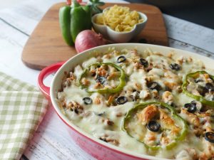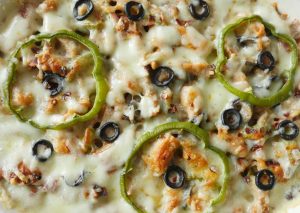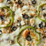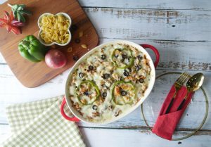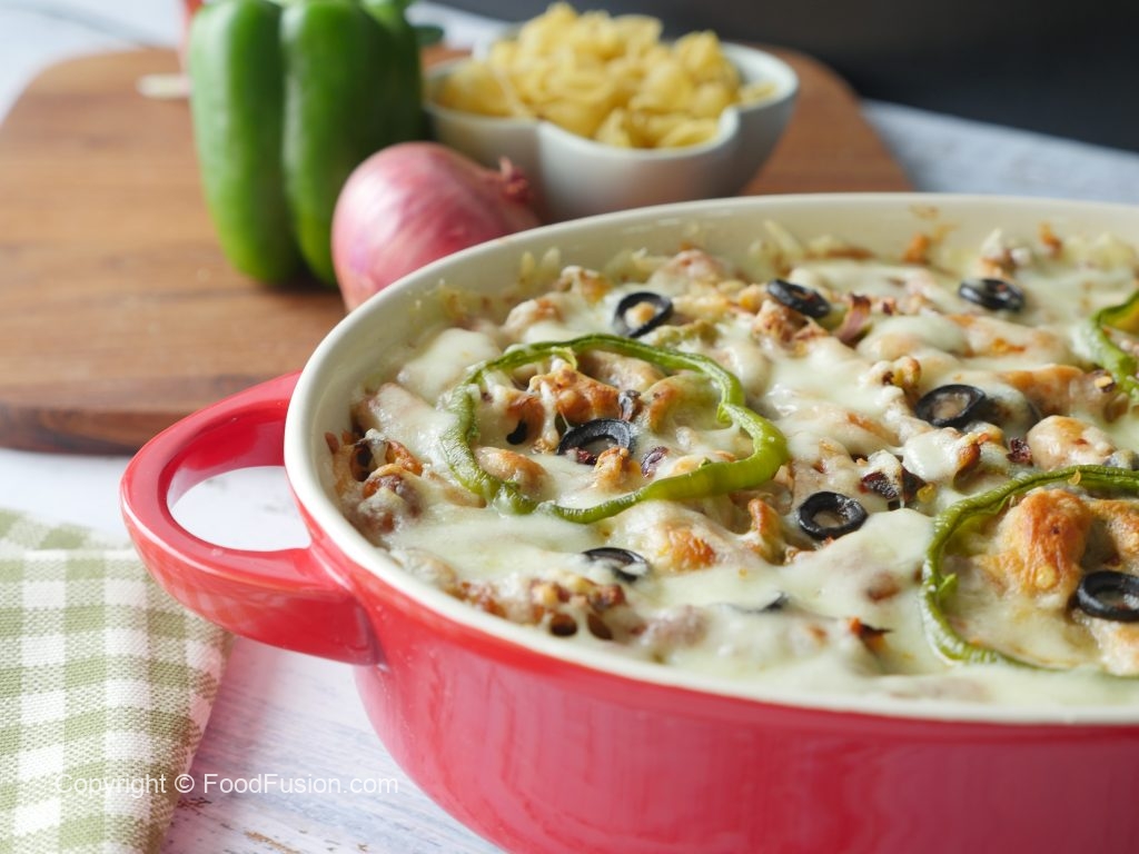 Grease baking dish with oil,add & spread pasta,chicken & vegetable topping,cheddar cheese,mozzarella cheese,capsicum,black olives and sprinkle red chili crushed.