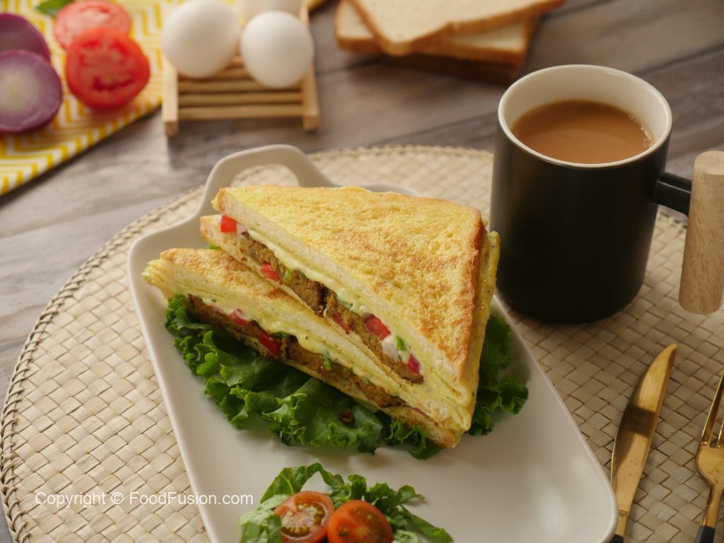 Add onion,tomato,green chilli,fresh coriander and cheese slice and flip the other bread slice over it,press gently & cook on low flame until cheese melts.