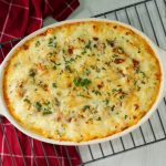 -Baking dish mein tayyar mince mixture,mac & cheese,mince mixture,mac 7 cheese,mince mixture, cheddar cheese,mozzarella cheese & fresh parsley dal dein.