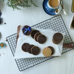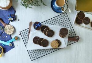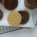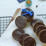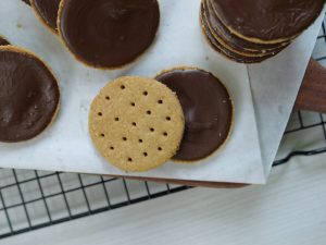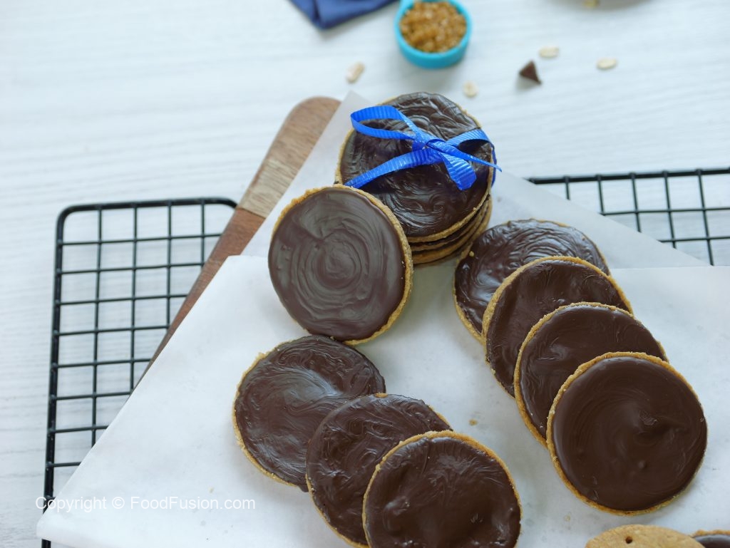 -Spread melted chocolate on one side of biscuits & let it set at room temperature (makes 28).