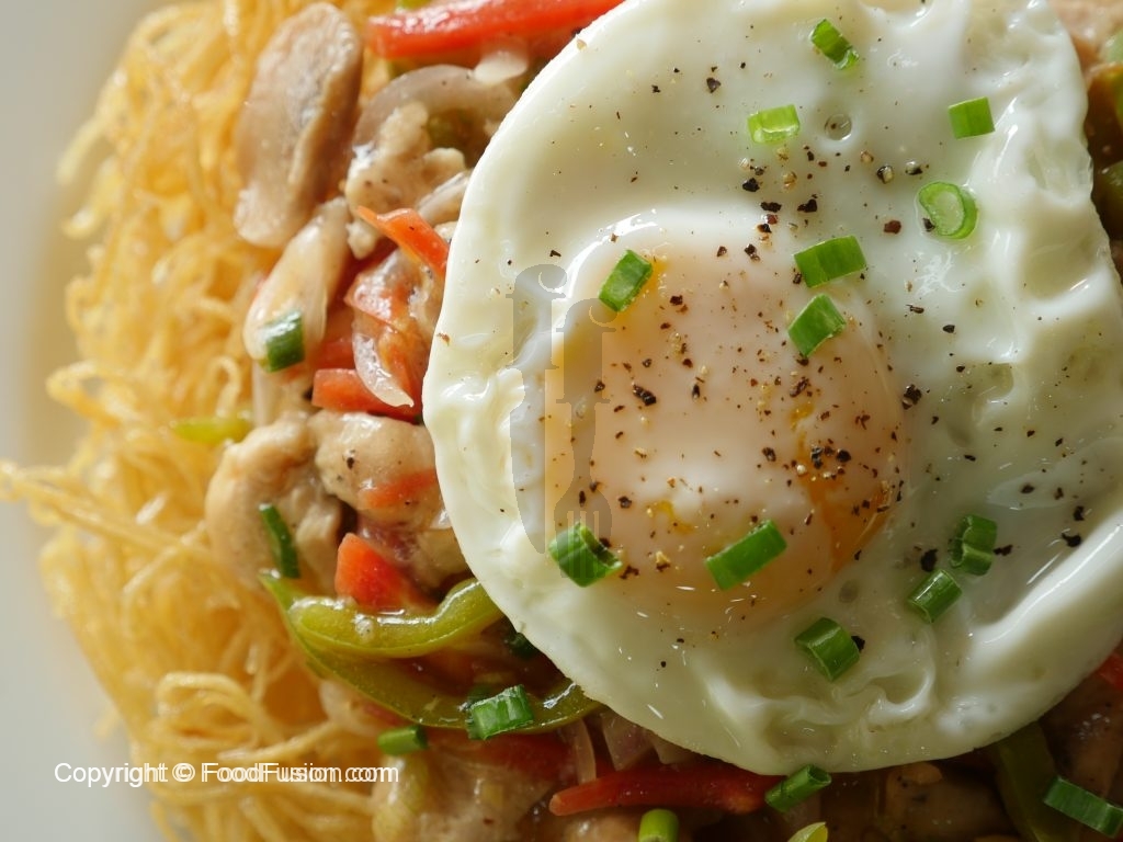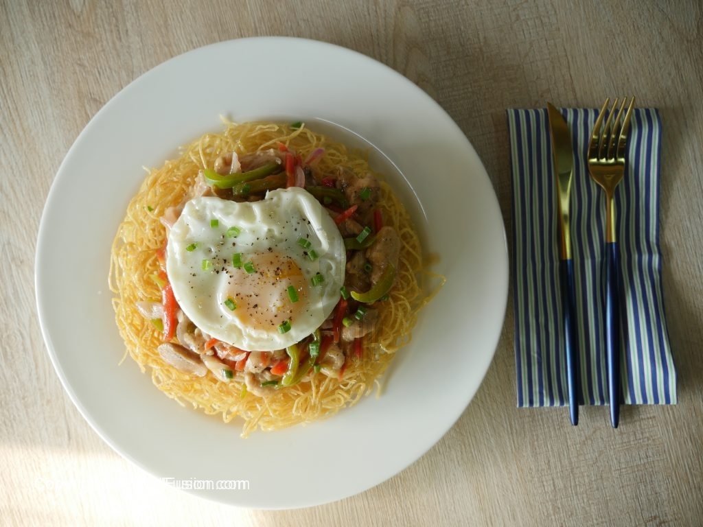 On serving place,place crispy fried noodles,chicken with sauce,fried egg,black pepper crushed,green onion & serve.