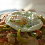 Serving plate mein crispy fried noodles rakh dein aur chicken with sauce,fried anda,kali mirch crushed aur hara pyaz dal ker serve karein.