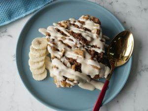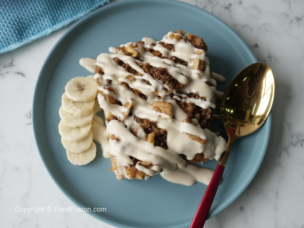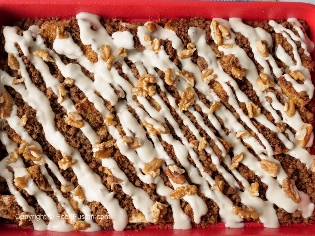 Sprinkle the prepared topping over the soaked bread & bake in preheated oven at 180C for 35-40 minutes (both grills on).
