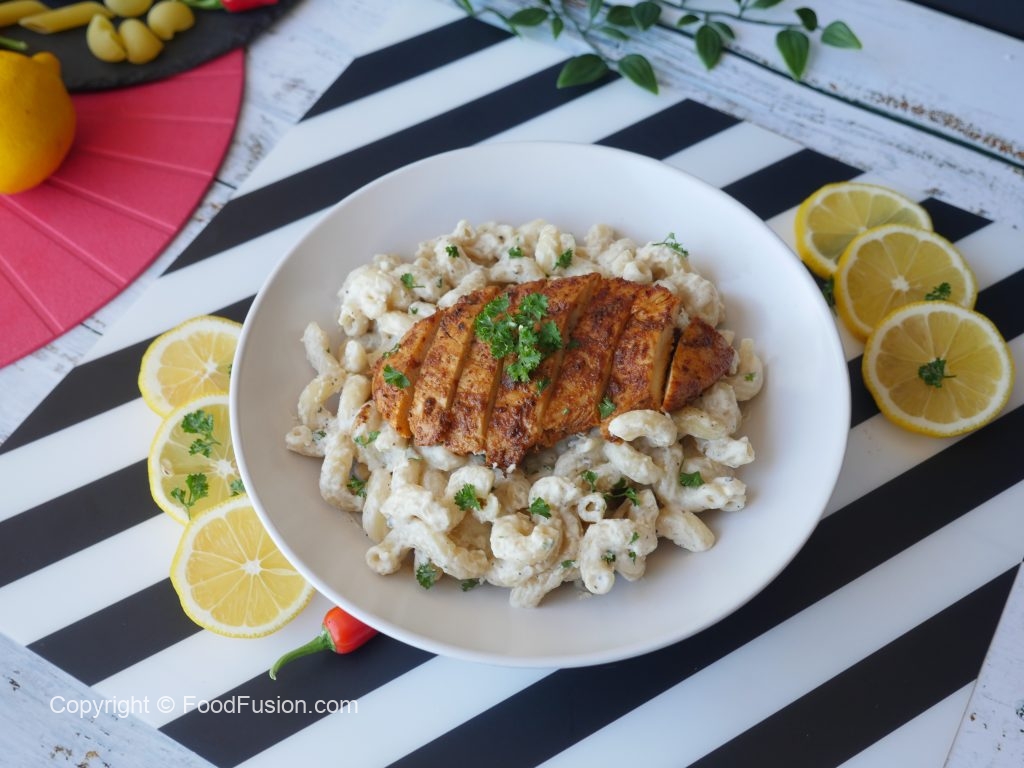 Serving plate mein pasta dal ker grilled chicken rakh dein aur fresh parsley sa garnish ker ka serve karein!