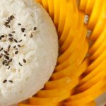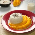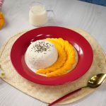 -Serving plate mein sticky rice,mango slices,kalay til aur creamy coconut sauce dal kar serve karein!