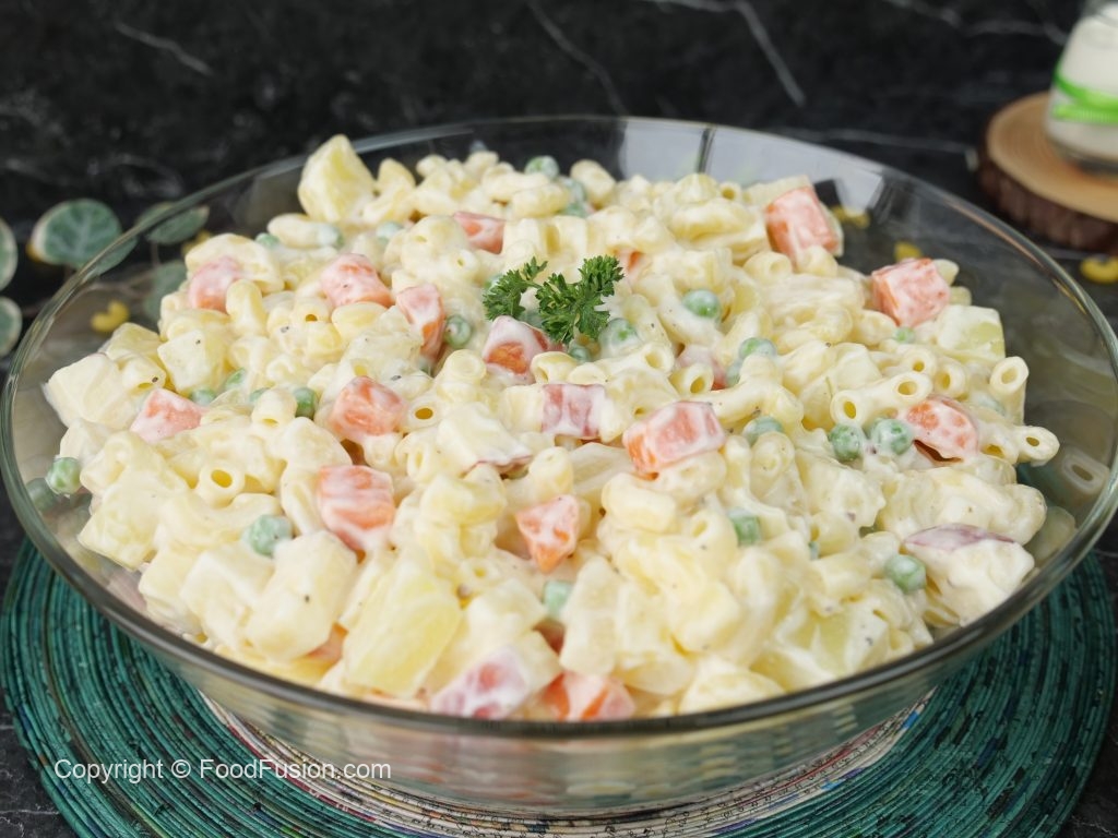 In a bowl,add potatoes,carrots,apple,peas,pineapple,boiled elbow macaroni & mix well.