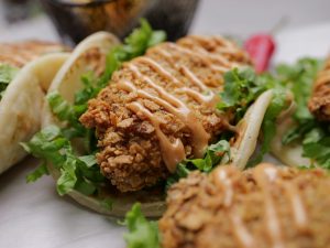 -On a flat bread,add lettuce leaves,crispy chicken slider,drizzle spicy mayo sauce & serve (makes 4)!