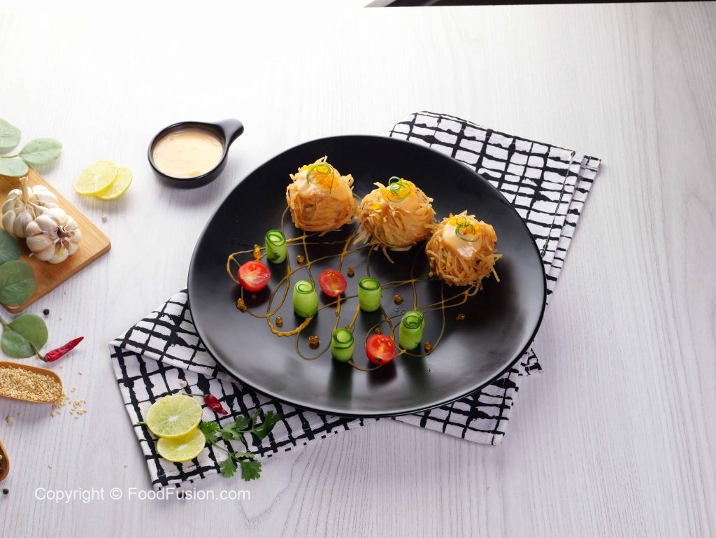 -Garnish karen bang bang sauce, caviar, green onion, cucumber aur cherry tomato ke saath.