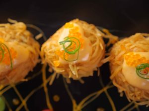 -Garnish with bang bang sauce,caviar,green onion,cucumber & cherry tomato.