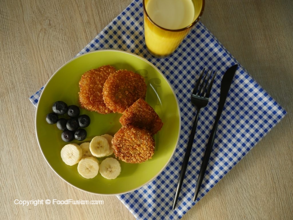 Ab bread slices ko pheetay hoye anday mein dip karein phir corn flakes mein coat ker lein.