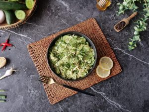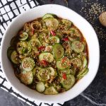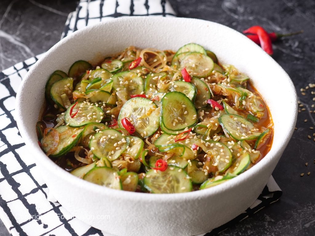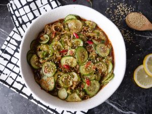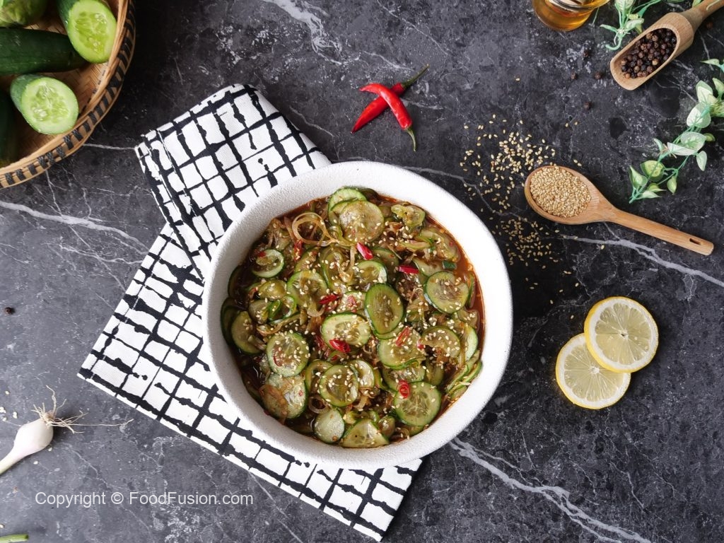 -In a bowl,add cucumber,white onion,garlic,spring onion,red chilli crushed,salt,sesame seeds,paprika powder,vinegar,soy sauce,sesame oil,honey & mix well.