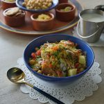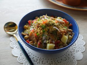 In serving plate,add papri,dumplings,chickpeas,potato,tomato,onion,salt,red chili crushed,chaat masala,cumin seeds,lemon juice,green chutney,date tamarind chutney,yogurt,chickpeas,papri,potato, tomato,onion,sev nimco,yogurt,green chutney,date tamarind chutney,green chutney,red chili crushed, salt,chaat masala,fresh coriander & serve!