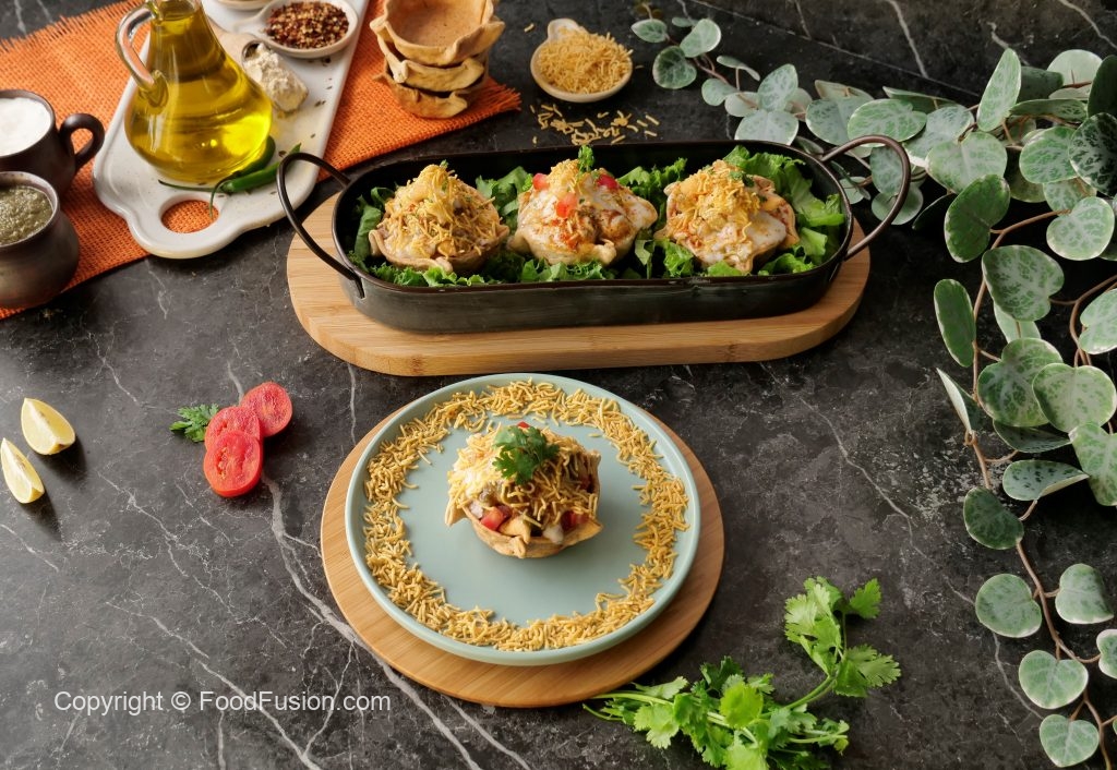 On dough pocket,add bhondi,chaat masala,potato,tomato,onion,spicy hari chutney,imli ki meethi chutney,prepared yogurt,chaat masala,red chilli powder,sev nimco & serve!